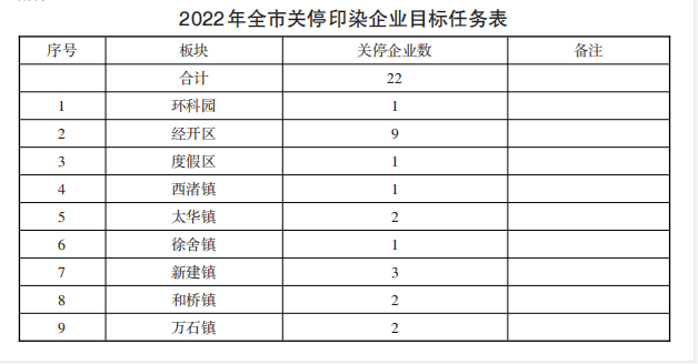 其中2022年要推進完成以下類型印染企業的關停工作:一是重點敏感區域內企業。重點是位于太湖一級保護區和飲用水水源地保護區的企業。二是印染集聚區外非單點保留企業。主要是位于和橋印染集聚區、屺亭印染集聚區、西渚印染集聚區、新建印染集聚區外的印染企業(單點保留企業除外)。三是印染集聚區內安全環保隱患較多、整改難度較大,以及不符合屬地產業發展方向、單體規模相對偏小、畝均績效相對較低的印染企業。