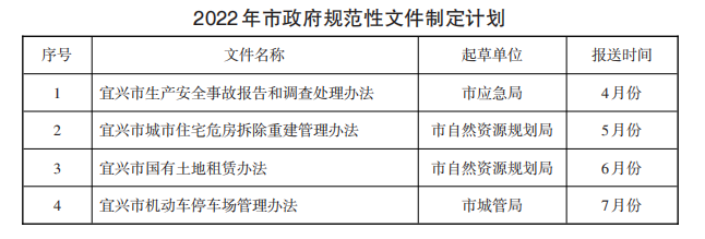 經市政府研究同意,現將《2022年市政府規范性文件制定計劃》(附件1)印發給你們,計劃由市司法局負責組織實施。市各相關部門要按照《無錫市行政規范性文件制定和備案審查管理辦法》(無錫市人民政府令第179號)、《宜興市規范性文件制定辦法》(宜興市人民政府令第98號)的規定,認真做好市政府規范性文件的調研、起草等工作,在規定時間內報市司法局合法性審核,審核通過后提交市政府審議。未經市司法局審核、市政府審議決定,規范性文件不得發布。