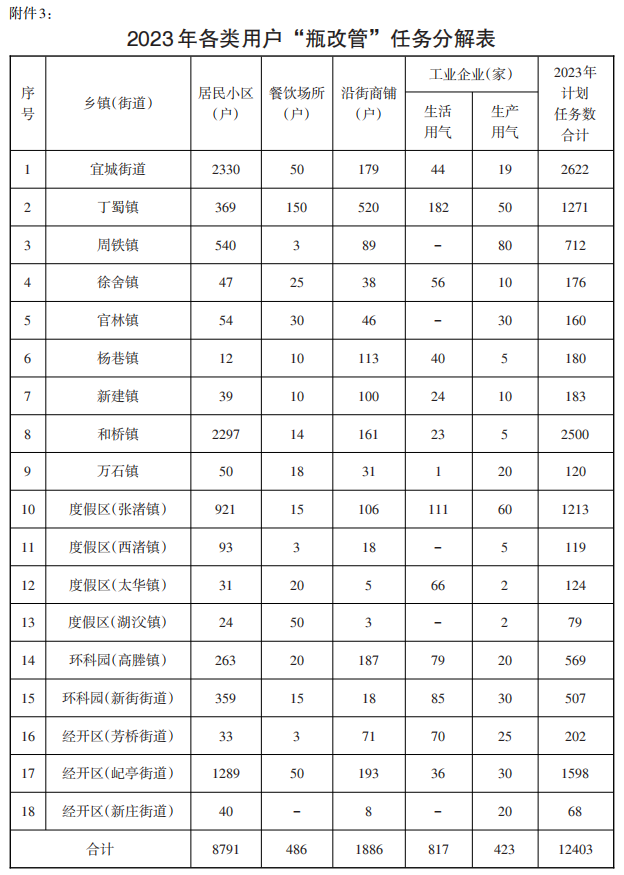(二)加快用戶天然氣改造。三年計劃完成規劃發展村和一般村莊等10萬戶農村居民管網配套建設和入戶工作。2023年,對天然氣管網覆蓋范圍內和已接通天然氣的所有符合改造條件的城中村、老舊小區等居民用戶,以及餐飲場所、公服單位、工業企業、沿街店鋪等非居民瓶裝燃氣用戶,全面實施管道天然氣改造(以下簡稱“瓶改管”),實現全市瓶裝燃氣用戶的“應改盡改”。