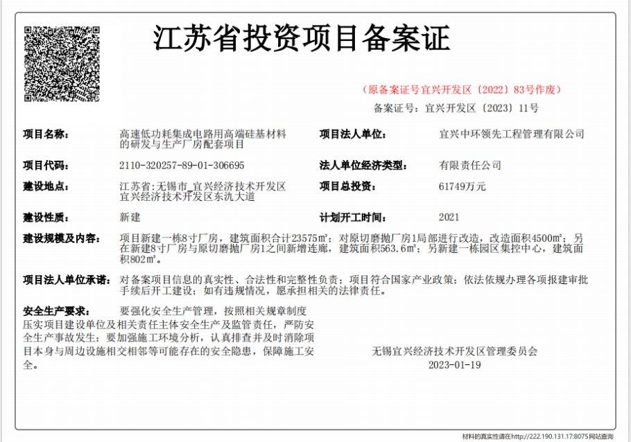 中環領先半導體材料有限公司高速低功耗集成電路用高端硅基材料的研發與生產項目備案證