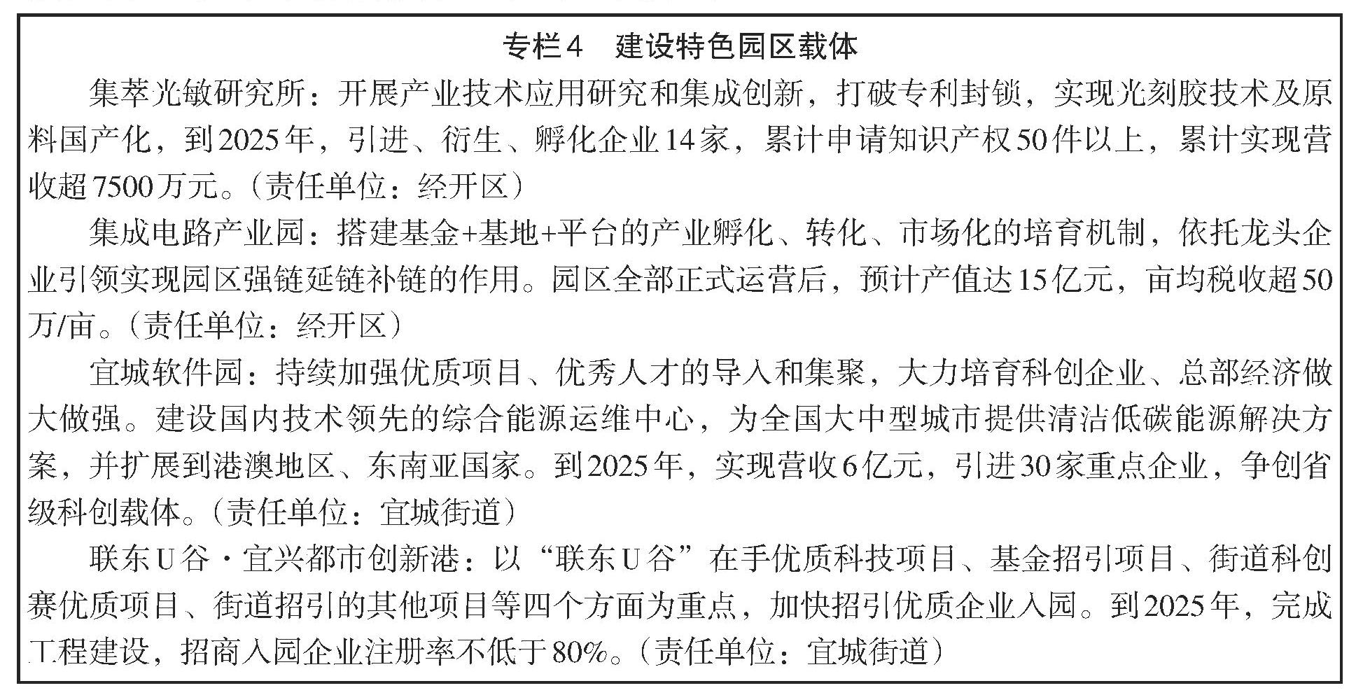 統(tǒng)籌產(chǎn)業(yè)空間布局,建設(shè)特色鮮明的專業(yè)化園區(qū)載體。鼓勵(lì)創(chuàng)新載體建設(shè),促進(jìn)資源整合、上下游企業(yè)協(xié)同,突破一批產(chǎn)業(yè)共性與關(guān)鍵技術(shù),為產(chǎn)業(yè)發(fā)展提供堅(jiān)實(shí)的技術(shù)支持。支持龍頭企業(yè)的行業(yè)吸引力,推動(dòng)集成電路產(chǎn)業(yè)園等載體建設(shè),著力打造以材料為特色的專業(yè)化園區(qū),形成一批具有自主知識(shí)產(chǎn)權(quán)的代表性產(chǎn)品,打造掌握關(guān)鍵技術(shù)、擁有核心材料量產(chǎn)能力的產(chǎn)業(yè)集聚區(qū)。做大做強(qiáng)宜城軟件園,不斷提升產(chǎn)業(yè)承載能力,聚焦人工智能、大數(shù)據(jù)、信創(chuàng)等前沿重點(diǎn)領(lǐng)域,引育一批掌握關(guān)鍵核心技術(shù)的生態(tài)主導(dǎo)型企業(yè),推動(dòng)形成能源管理、電子商務(wù)等領(lǐng)域的典型應(yīng)用場(chǎng)景,打造具有宜興本地特色的軟件產(chǎn)業(yè)發(fā)展生態(tài)。推動(dòng)聯(lián)東U谷•宜興都市創(chuàng)新港建設(shè),圍繞新一代信息技術(shù)產(chǎn)業(yè)、高端裝備兩大主導(dǎo)產(chǎn)業(yè)和人工智能特色產(chǎn)業(yè)進(jìn)行布局,打造智能制造聚合研發(fā)創(chuàng)新、中試成果轉(zhuǎn)化功能,高端生產(chǎn)企業(yè)總部和生產(chǎn)配套等功能于一體的全國(guó)縣域都市科創(chuàng)產(chǎn)業(yè)示范園區(qū)。(責(zé)任單位:市工業(yè)和信息化局,經(jīng)開區(qū)、宜城街道)