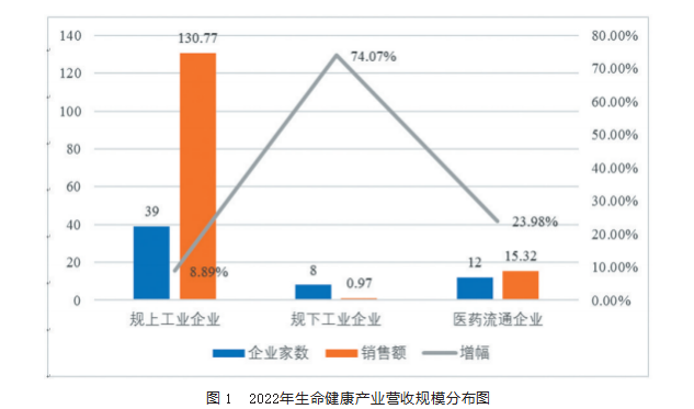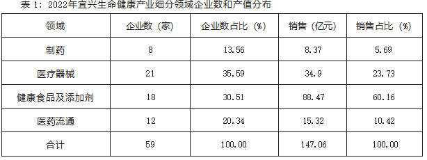 宜興市生命健康產業起步較晚,2022年生命健康產業企業59家,實現銷售147.06億元,同比增長10.56%,其中規上工業企業39家,總銷售額130.77億元,同比增長8.89%;規下工業企業8家,銷售額0.97億元,同比增長74.07%;醫藥流通企業12家,銷售額15.32億元,同比增長23.98%。總體上,生命健康產業呈產銷平穩增加、盈利明顯增強的態勢,成為經濟快速增長的重要組成部分。