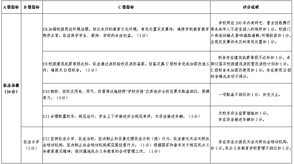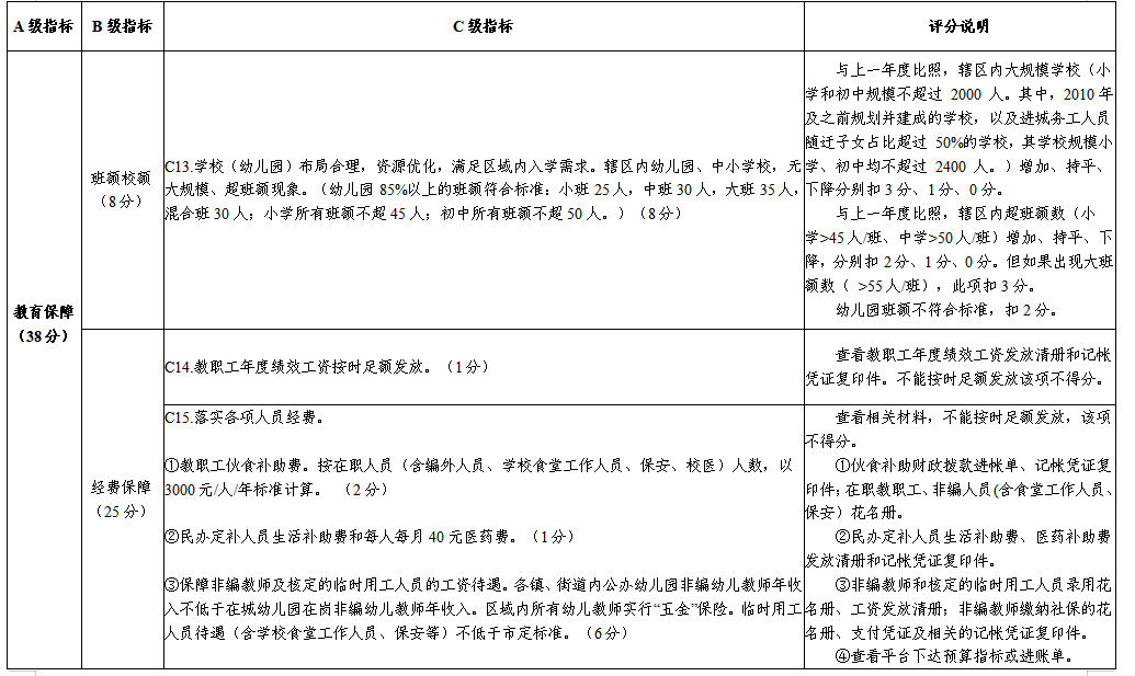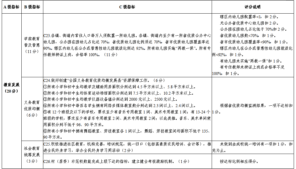 評價指標(biāo)由基礎(chǔ)部分和加分部分組成。基礎(chǔ)部分由“黨的領(lǐng)導(dǎo)”“依法治教”“教育保障”“教育發(fā)展”“重點工作”“問題整改”6個一級指標(biāo)組成,總分100分。加分部分由“學(xué)前教育”和“資源建設(shè)”2個一級指標(biāo)組成,依據(jù)實際情況考核,分值不設(shè)上限。(具體考評細(xì)則詳見附件)