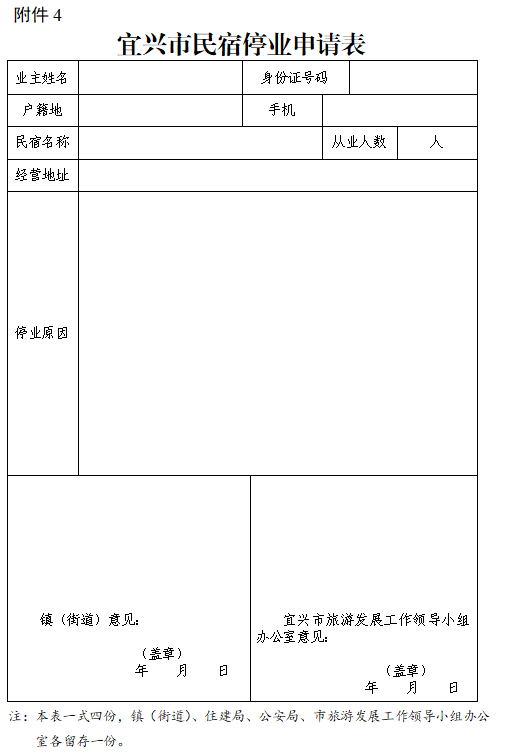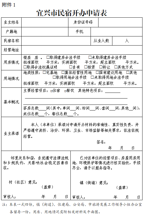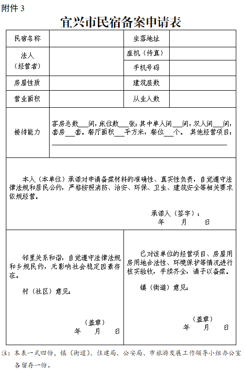 本意見實施之日前已經(jīng)營業(yè)的民宿,經(jīng)營業(yè)主填報《宜興市民宿備案申請表》(附件3),提交營業(yè)執(zhí)照、衛(wèi)生許可證、食品經(jīng)營許可證、特種行業(yè)許可證、第三方房屋安全檢測報告等相關(guān)證照,由所在鎮(zhèn)(街道)民宿管理辦公室核實后報市旅游發(fā)展工作領(lǐng)導(dǎo)小組辦公室。市旅游發(fā)展工作領(lǐng)導(dǎo)小組辦公室召集相關(guān)職能部門進行現(xiàn)場聯(lián)合驗收合格后辦理備案手續(xù)。