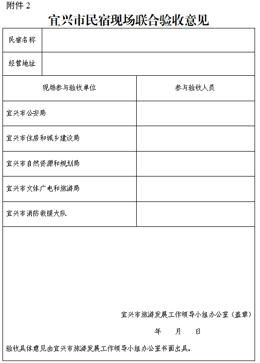 3、相關(guān)部門驗收。民宿業(yè)主在經(jīng)營前,報鎮(zhèn)(街道)民宿管理辦公室提請市旅游發(fā)展工作領(lǐng)導(dǎo)小組辦公室組織進行現(xiàn)場聯(lián)合驗收,由參與驗收的相關(guān)職能部門依法出具宜興市民宿現(xiàn)場聯(lián)合驗收意見(附件2)。驗收不合格的,由相關(guān)職能部門依法出具整改意見。經(jīng)整改后,民宿業(yè)主可再次按程序申請現(xiàn)場驗收。民宿業(yè)主也可不進行開辦申請、前期指導(dǎo),直接申請聯(lián)合現(xiàn)場驗收。