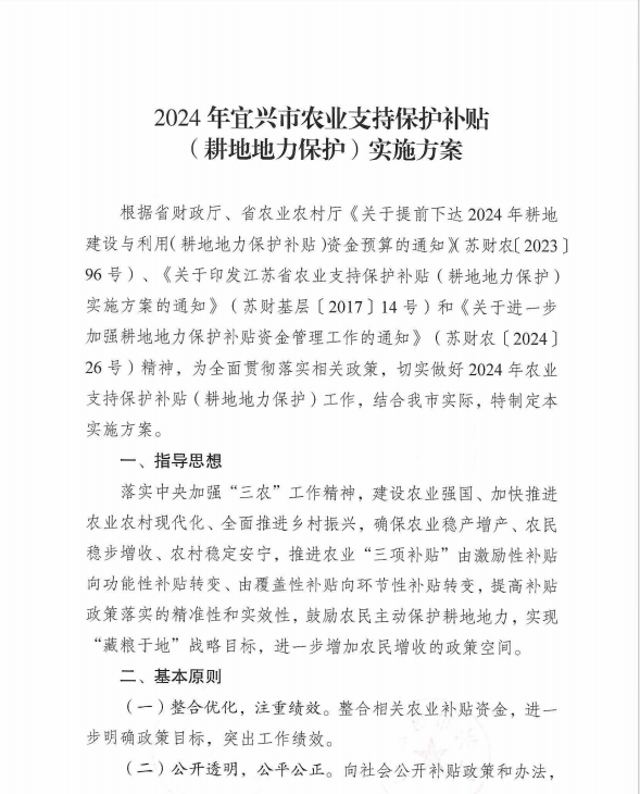 轉發《2024年宜興市農業支持保護補貼(耕地地力保護)實施方案》