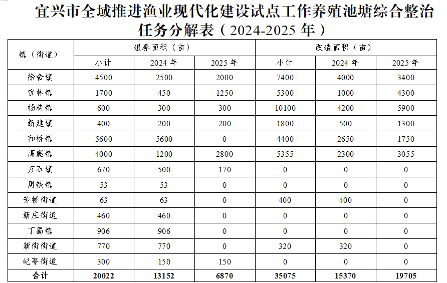 (一)編制全域建設規劃。完成全市池塘養殖的面積、種類、產量、排水信息等底數的全面摸排,形成完整的臺賬資料,并建立信息數據庫。按照“空間布局合理、規模集中連片、水系及設施配套”的要求,突出關鍵環節,排出時間節點,重點圍繞滆湖灣、西部圩區及“三氿五蕩”等區域,編制漁業現代化建設規劃。(市農業農村局牽頭,宜興生態環境局配合,各鎮、街道具體落實)