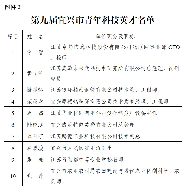 為深入貫徹落實習近平總書記在中央人才工作會議上的重要講話精神,加快推進新時代人才強市建設,團結引領廣大科技工作者當好高水平科技自立自強的排頭兵,在全社會營造崇尚科學、尊重人才、鼓勵創新的良好風尚,前期,由市委組織部、宣傳部、人社局、科技局、科協多單位聯合開展了第三屆“宜興市科技之星”、第九屆“宜興市青年科技英才”評選工作,并通過基層推選、部門初審、專家組聯合會審等程序,形成了獲評名單上報市政府。現市政府決定,授予白福崗等17位科技工作者第三屆“宜興市科技之星”稱號(名單見附件1),授予謝智等10位科技工作者第九屆“宜興市青年科技英才”稱號(名單見附件2)。