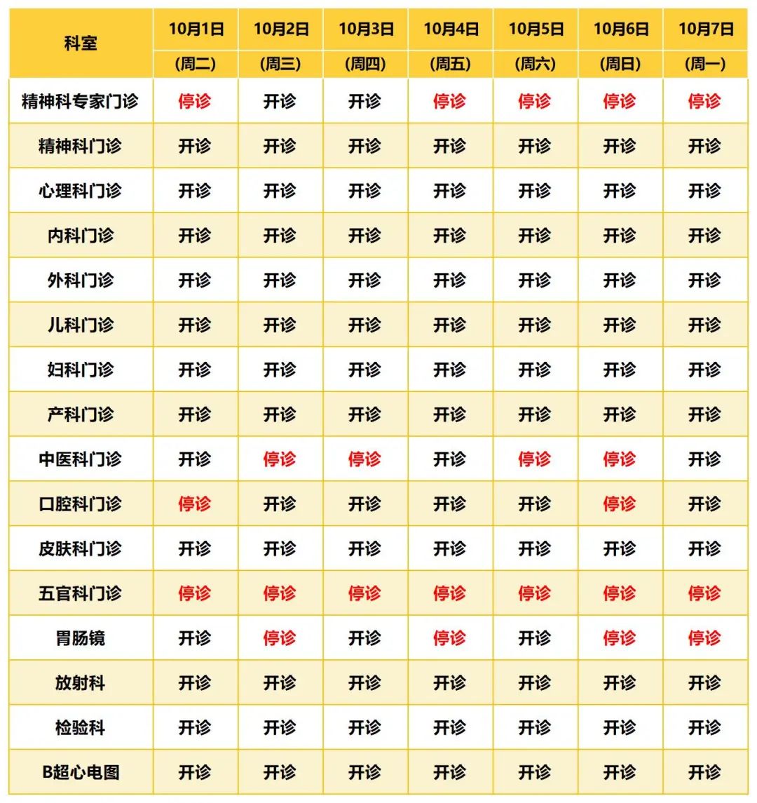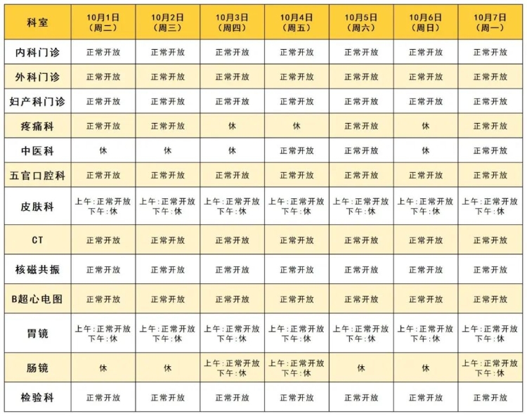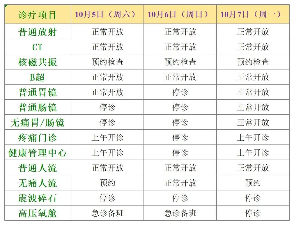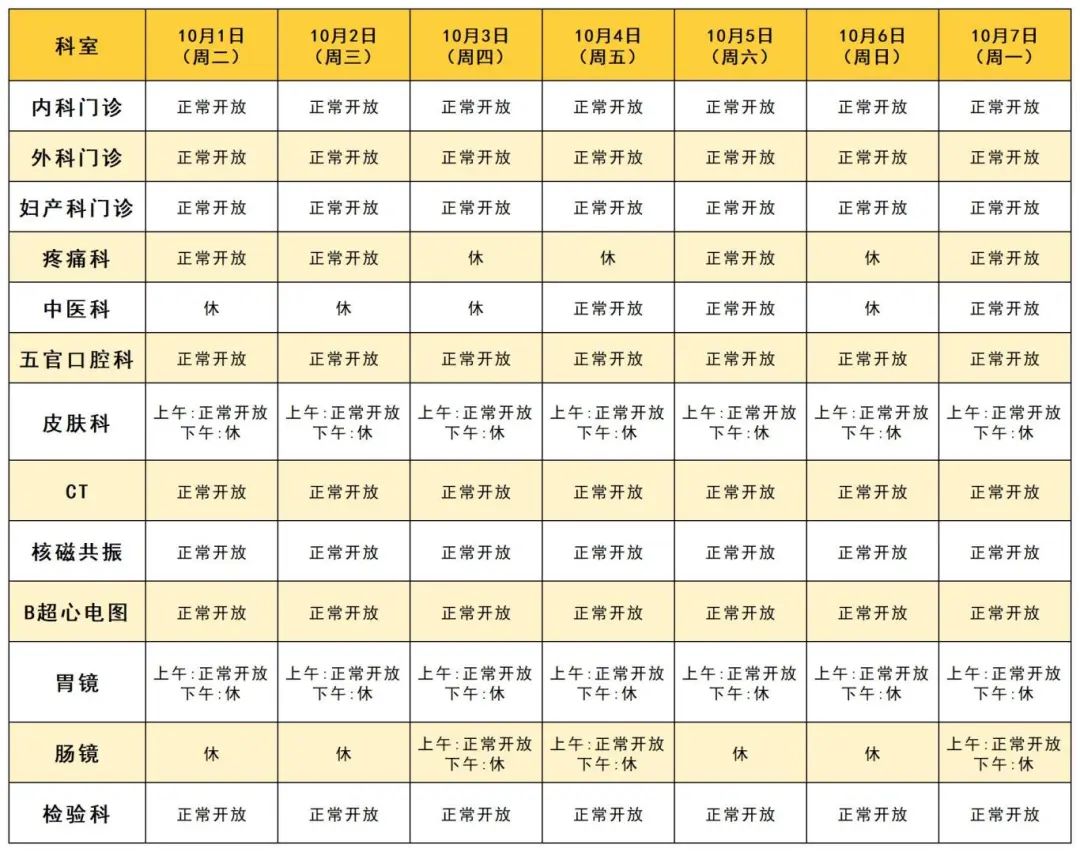 1、外科門診/精篩門診開放7天(10月1-3日上午,4-7日全天);