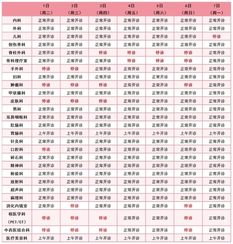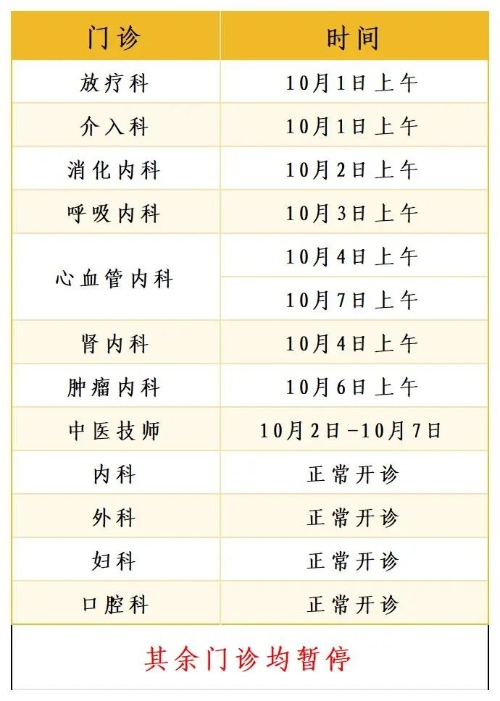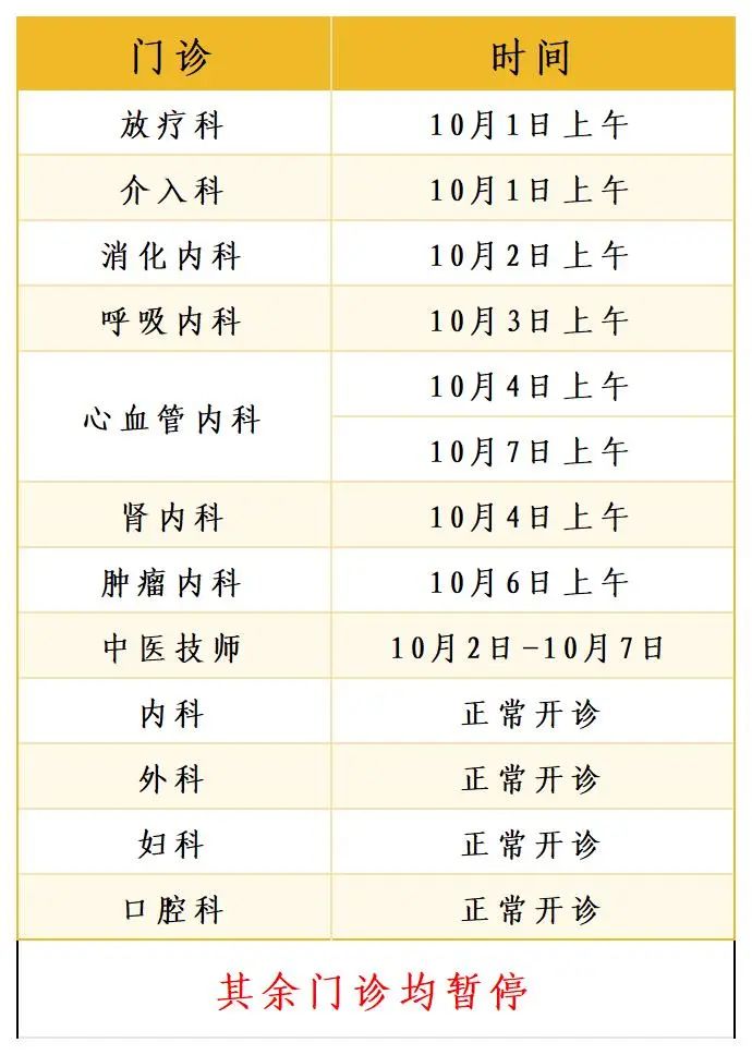 2、成人體檢中心、“兩癌”篩查門診、內科門診、乳腺門診10月1日至10月7日暫停。