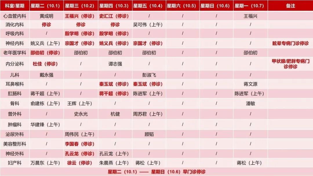 門診各專科普通門診、專家門診排班信息詳見排班表(小程序、醫院官網可查詢),高級專家門診停診。