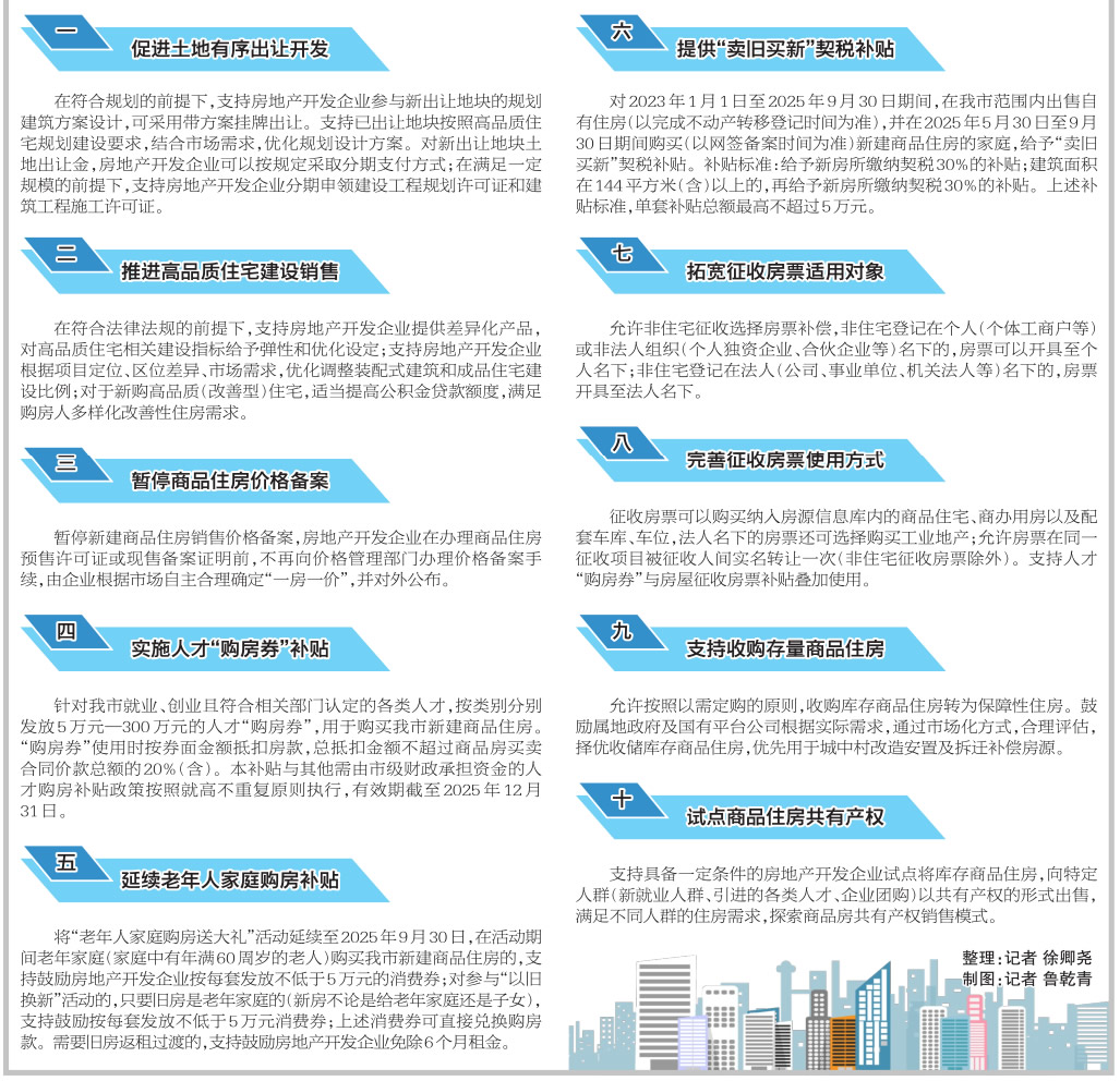 促進土地有序出讓開發、推進高品質住宅建設銷售、實施人才“購房券”補貼……6月1日,我市發布促進住房領域消費十條措施。市住房和城鄉建設局相關工作人員表示,此次出臺的十條措施,旨在從土地開發、住宅品質、購房補貼、房票使用等方面進一步保障房地產市場健康發展,讓市民買房既省錢又安心。