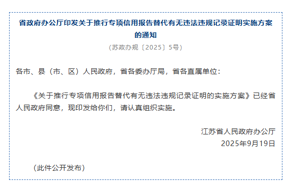 為深入貫徹黨中央、國務院決策部署,落實《國家發展改革委、公安部、國家數據局關于全面推行以專項信用報告替代有無違法違規記錄證明的通知》(發改財金〔2025〕565號),為企業和群眾提供“一件事一次辦”服務,進一步提升行政效能、優化營商環境,現就全省推行以專項公共信用信息報告替代有無違法違規記錄證明(以下簡稱“信用代證”),制定本實施方案。