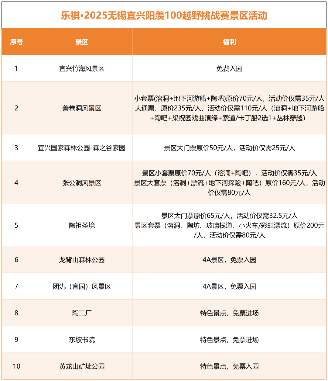 僅限“2025陽(yáng)羨100越野挑戰(zhàn)賽”參賽選手,憑報(bào)名信息或參賽憑證享受優(yōu)惠(本活動(dòng)優(yōu)惠價(jià)不與其他優(yōu)惠疊加使用)。