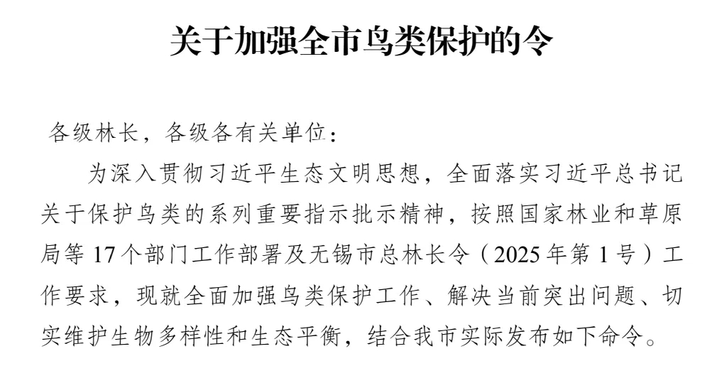 10月28日,為深入貫徹習近平生態文明思想,全面落實習近平總書記關于保護鳥類的系列重要指示批示精神,按照國家林業和草原局等17個部門工作部署及無錫市總林長令(2025年第1號)工作要求,我市發布《關于加強全市鳥類保護的令》(2025年第2號),全面加強鳥類保護工作、解決當前突出問題、切實維護生物多樣性和生態平衡。