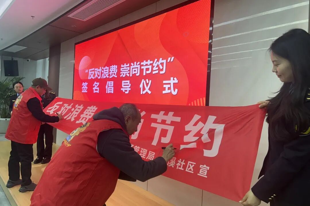 活動伊始,在活動中心醒目處懸掛起了“反對浪費 崇尚節約”主題橫幅。在“陶小獅”志愿者簡要介紹了活動目的與意義后,社區居民與騎手代表積極響應,有序來到橫幅前,鄭重簽下自己的名字。一個個簽名,不僅是對自身厲行節約的承諾,更是對營造浪費可恥、節約為榮社會氛圍的支持?,F場志愿者向參與者發放宣傳手袋,講解《中華人民共和國反食品浪費法》的重點內容,讓大家在潛移默化中加深對節約理念的理解,明確法律框架下的 “節約之道”。