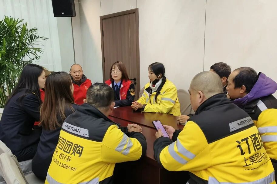 簽名儀式后,活動進入了溫馨的座談環節。市市場監管局婦聯主席、外賣送餐行業黨委委員、“陶小獅?市監銀輝”老黨員及社區相關負責同志與騎手代表們圍坐一堂,進行了面對面、心貼心的交流。座談聚焦騎手們的日常工作與生活,認真聽取了他們在配送過程中觀察到的餐飲浪費現象、自身在工作和生活中踐行節約的體會與做法,深入了解了他們在職業發展、權益保障、工作條件、健康關懷、社會融入以及參與社會治理等方面的現實需求與寶貴建議。